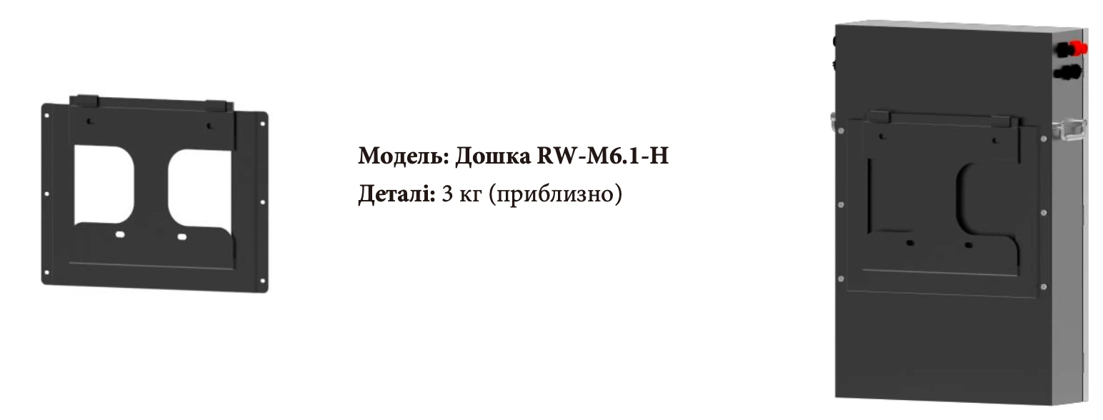 1.Кріпильна дошка для акумулятора RW-M6.1-H є важливим аксесуаром, який входить до комплекту. Спеціально розроблена для зручного настінного встановлення, вона слугує надійною платформою для кріплення приладу. Незалежно від того, для житлового чи комерційного використання, основа RW-M6.1-H спрощує процес встановлення, оптимізуючи використання простору.
